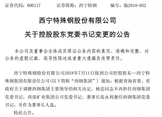 近日,西寧特鋼發布公告稱,2018年7月11日公司接到控股股東--西寧特殊鋼集團有限責任公司(以下簡稱“西鋼集團”) 通知:根據青海省委、省政府關于調整西鋼集團主要領導的相關決定,楊忠同志不再擔任西鋼集團黨委書記,西部礦業集團公司黨委書記、董事長張永利兼任西鋼集團黨委書記,并作為董事長人選。