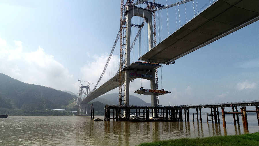 云浮西江特大橋是清云高速規模最大、建設條件最復雜、技術難度最高的特大橋工程。主橋為雙塔雙跨吊鋼箱梁懸索橋,邊跨長202米,主跨長738米,橋面寬30米,采用雙向六車道標準建設。施工過程中,設計團隊通過充分研究,創新性地提出將錨錠置于路面以上,車輛從錨體中通過的“通道錨”設計,減少挖方9萬方,極大降低了對環境的破壞,同時是國內首次在全橋頂板上使用U肋機器人自動內焊技術,大幅提高橋面板焊趾處抗疲勞性能,降低橋梁壽命周期內的維護成本。