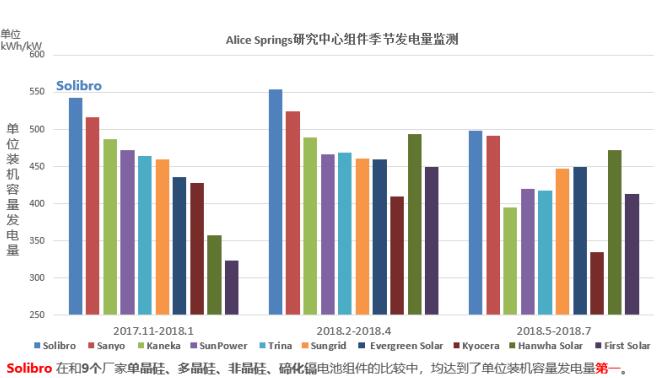 下圖是漢能Solibro和其他光伏生產商自2017年11月至2018年8月,每季度主要組件單位裝機容量發電量對比圖,Solibro始終占據第一。在2017.11-2018.1期間,Solibro組件每KW發電542.8度;2018.2-2018.4期間,Solibro組件每KW發電554.2度;2018.5-2018.7期間,Solibro組件每KW發電498.4度。