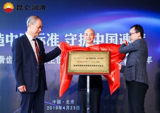中國(guó)石油潤(rùn)滑油公司首席科學(xué)家伏喜勝、中國(guó)中車首席技術(shù)專家闕紅波主任、北京交通大學(xué)博士生導(dǎo)師張弈黃教授共同為聯(lián)合實(shí)驗(yàn)室揭牌