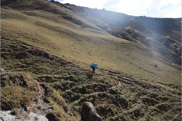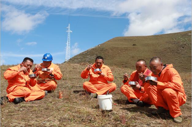 施工人員正在緊張地對塔新線第二回新建線路進行緊線工作。他們所在的位置是下拔桑一村的73號鐵塔,這基塔位于一座山的半山腰上,從山腳往上望去,巍峨的鐵塔屹立山間,在陽光的照射下發出金屬的光澤,但如何去到鐵塔腳下?這里完全沒有路,只能沿著山坡手腳并用地往山上爬去,項目經理鄧波說:“最近這段時間都沒有下雨,爬山還比較輕松,如果下雨的話,地面濕滑,爬山就很困難了。”在海拔3500米的地方爬山,沒爬一會,就已經感覺氣喘吁吁,“那材料是怎么運送上去的?”“我們之前有一只騾隊,專門來運輸材料。不過現在一些比較輕的物資,都是施工人員自己扛上去的。”鄧波解釋著。剛說完,便看見不遠處一位施工人員扛著一塊安全指示牌艱難地向上前行。