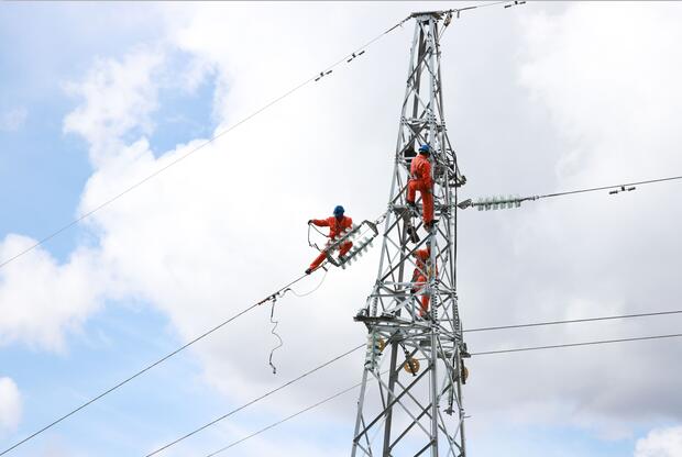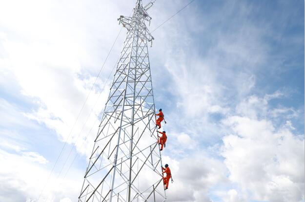 到達鐵塔腳下后,抬頭便看見三名身穿橘黃色工裝的人員在24米高的鐵塔上忙著放線、緊線,他們在高空中如履平地,熟練地操作進行著一系列的操作,“你們不害怕嗎?”當他們從塔上下來,準備吃午飯時,我問他們,“早就習慣了。”