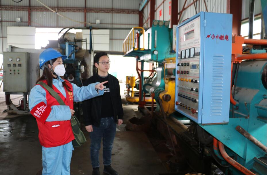 3月5日,在德江縣工業園區,該局第一服務隊員陳小飛、田莉筠走進德江縣德源科技有限公司,為企業恢復報停設備,助力企業開工投產。