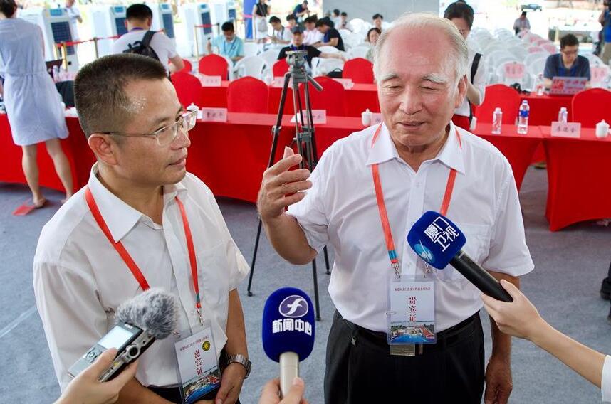 8月5日,在福建晉江舉行的福建向金門供水工程通水現場會上,來自金門的王再生老人(右)和福建省水投集團公司副總經理朱金良(左)接受采訪。 當日上午,福建向金門供水工程通水現場會在福建晉江舉行。與此同時,金門當地也舉行通水見證儀式。