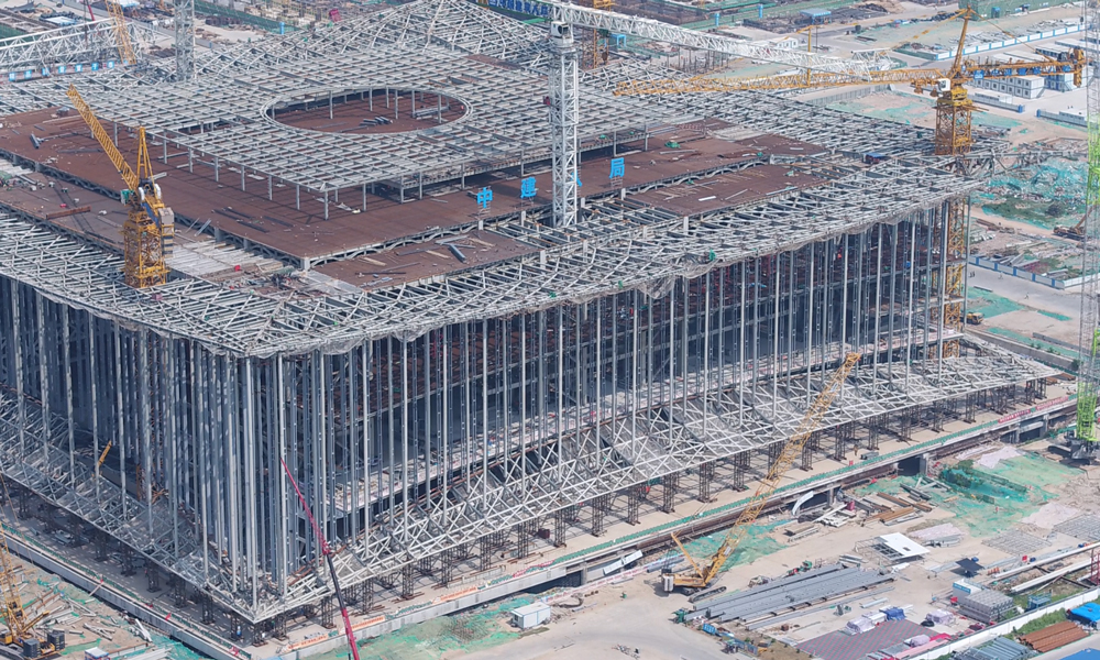 西安絲路國際會議中心工程項目幕墻高度58.80米,幕墻面積約20萬平方米,分為FS1大跨度組合鋼吊柱玻璃幕墻、FS2底層坐式全玻幕墻、FS3上下月牙金屬幕墻(基層為直立鎖邊屋面),幕墻造型復雜,且成弧線布置。圖為項目施工現場。(王文鐸 攝)目施工